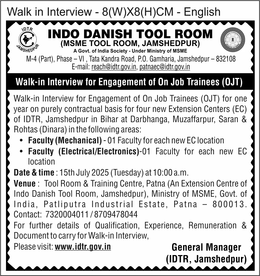 Walk-in Drive at MSME TC Patna for On the Job Trainee