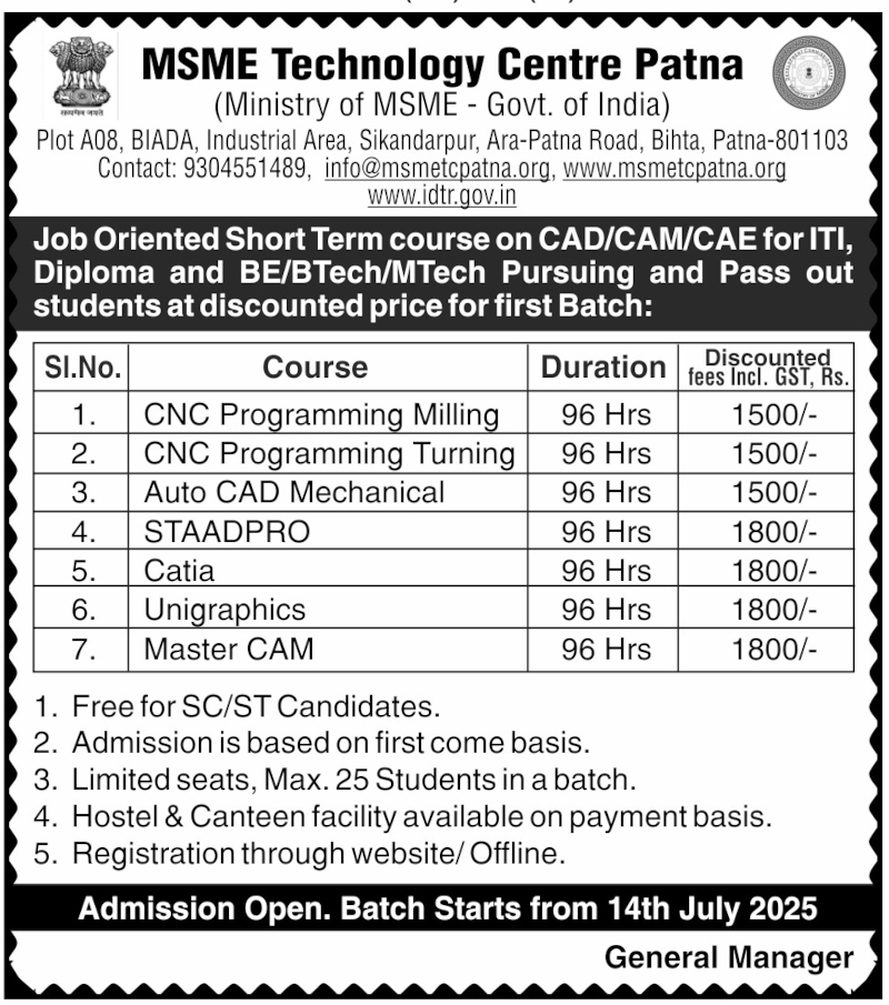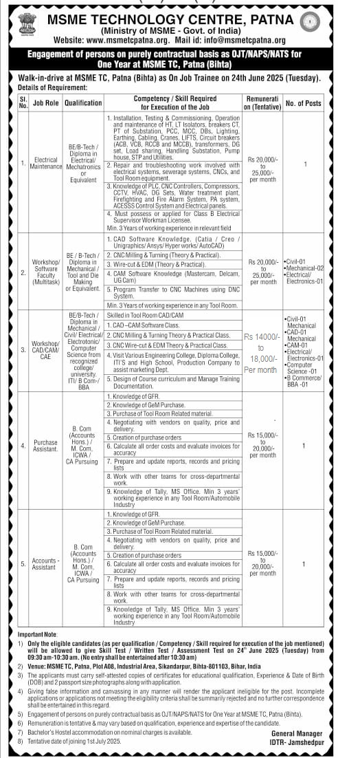 Walk-in Drive at MSME TC Patna for On the Job Trainee