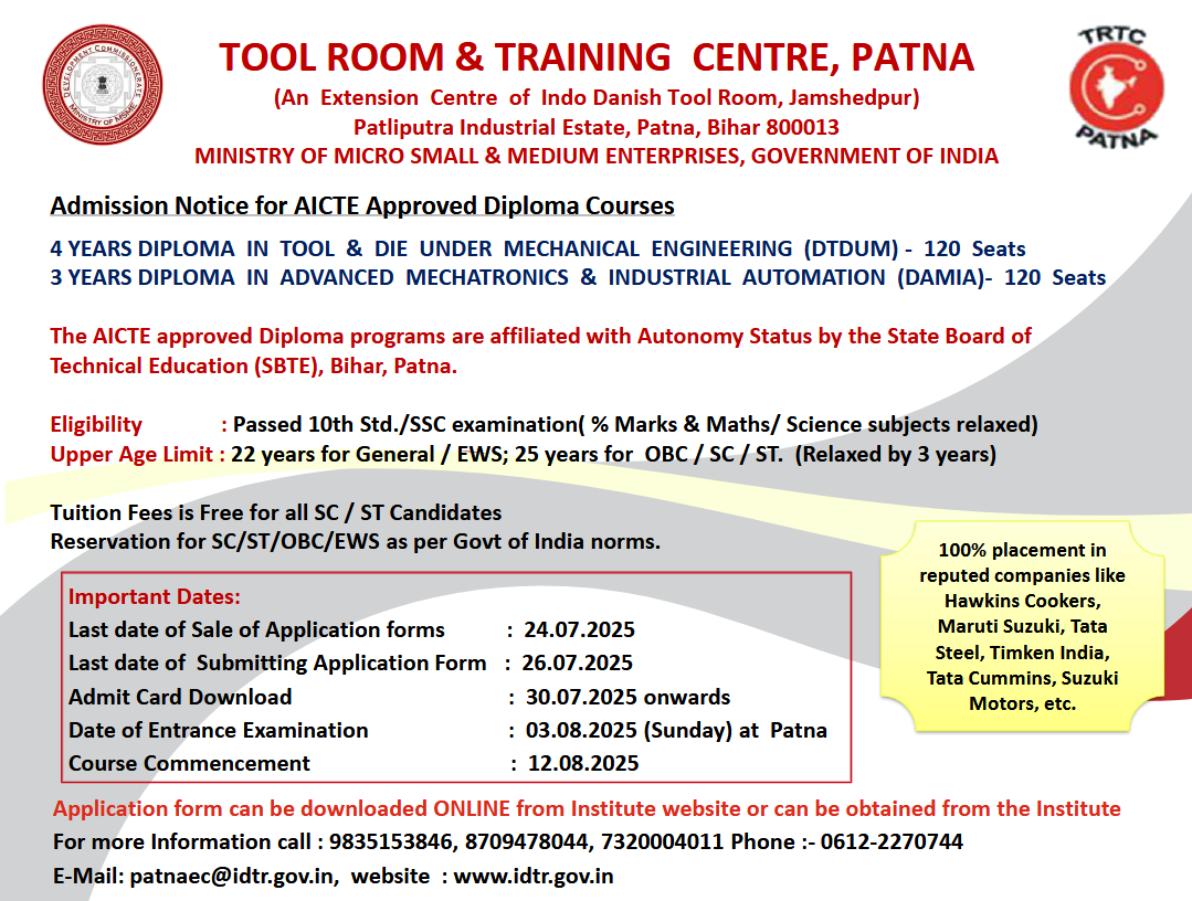 Admission Notice for AICTE Approved Diploma Courses at TRTC Patna