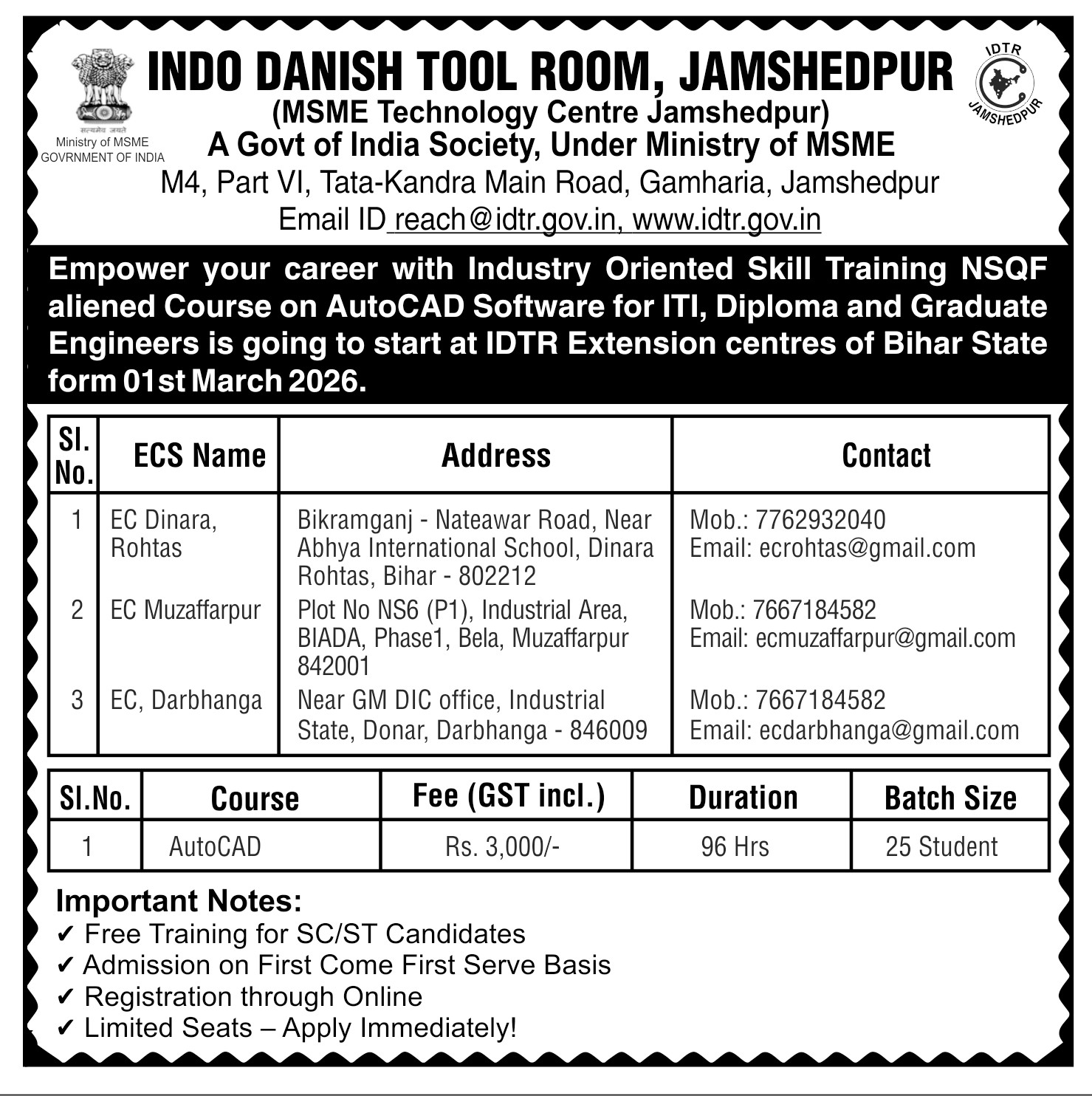 IDTR JAMSHEDPUR STARTING NEW NSQF COURSE .
